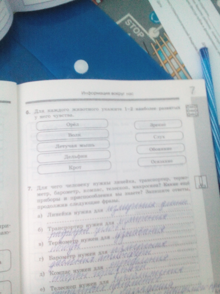 Для каждого животного укажите 1-2 наиболее развитых у него чувства