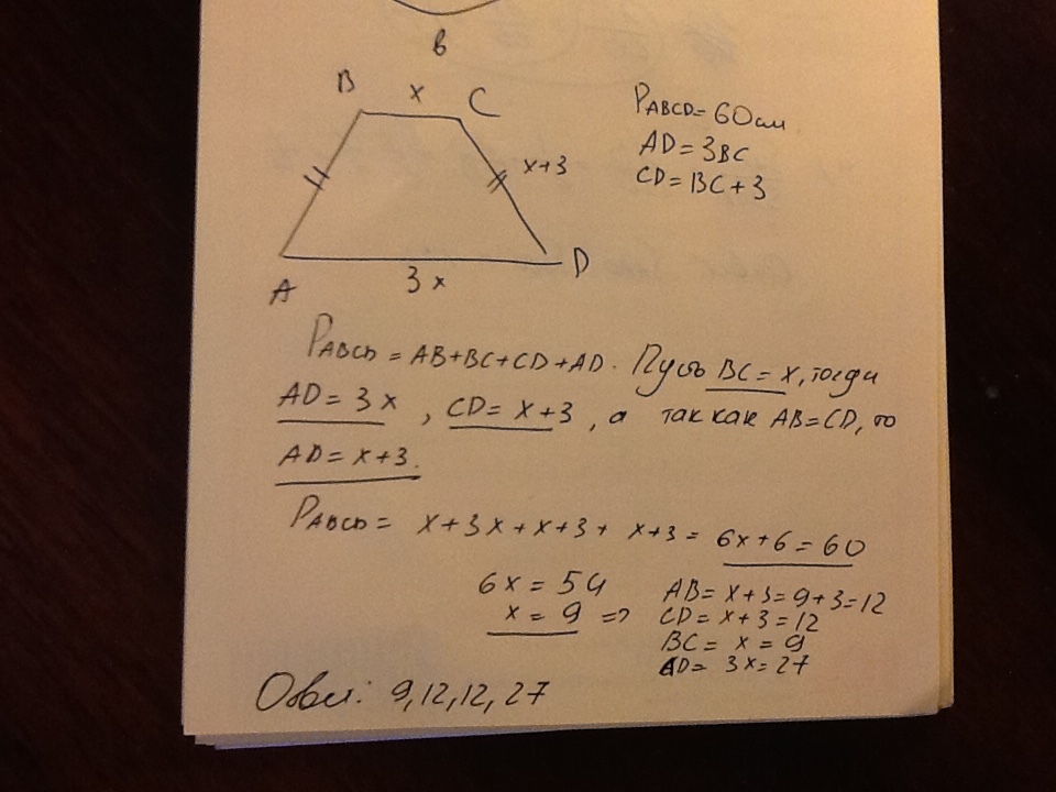 Боковая сторона на 3 см больше, чем меньшее основание.