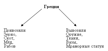 Купцы из Греции в колонии везли оливковое масло, изделия кузнецов и гончаров, вина, ткани, а колонии отправляли в Грецию хлеб, цветные и драгоценные металлы, сильных и умелых рабов, мед, воск, меха, лен.