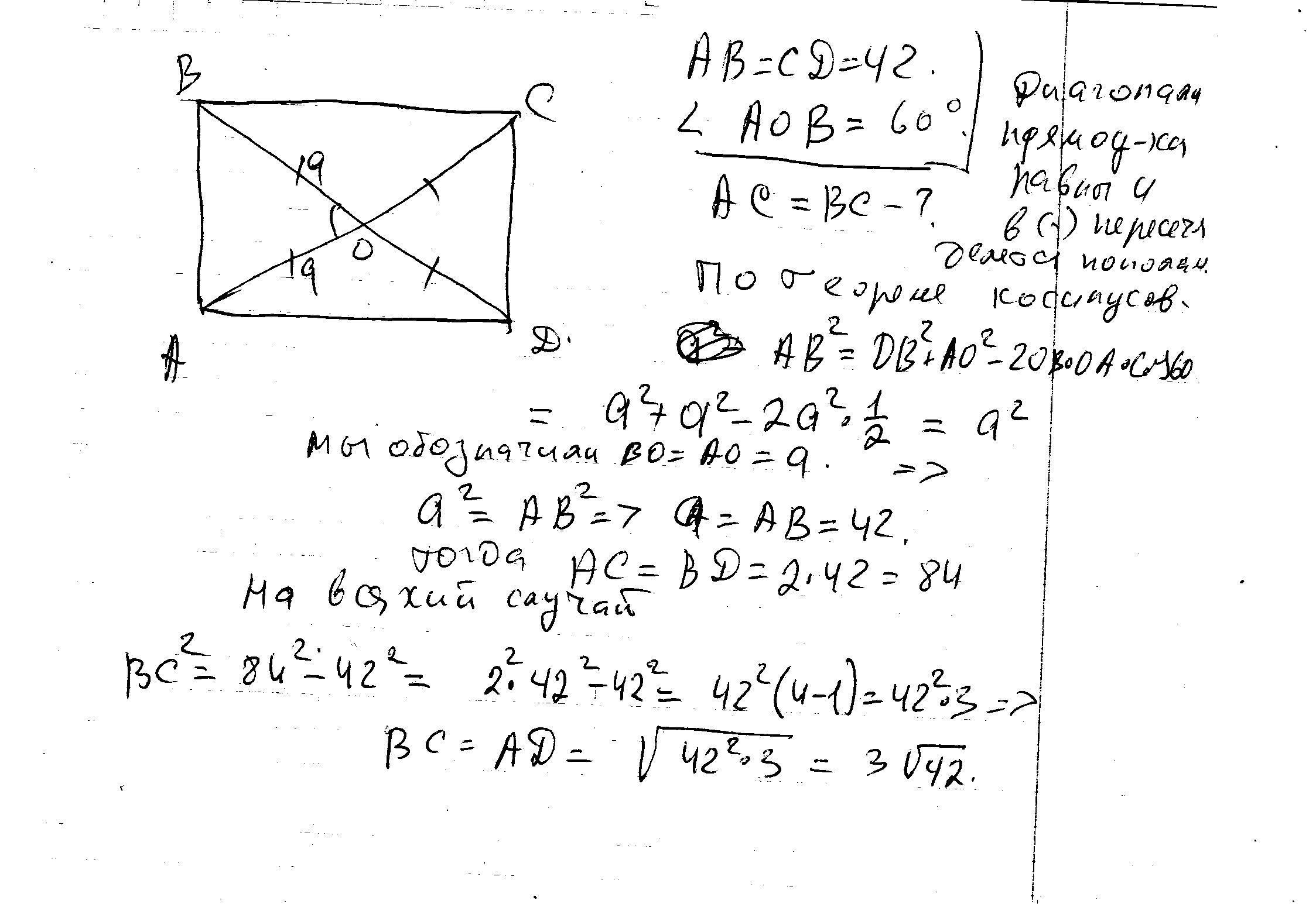 Меньшая сторона прямоугольника ровна 42,диагонали пересекаются под углом 60градусов.Найдите диагонали прямоугольника