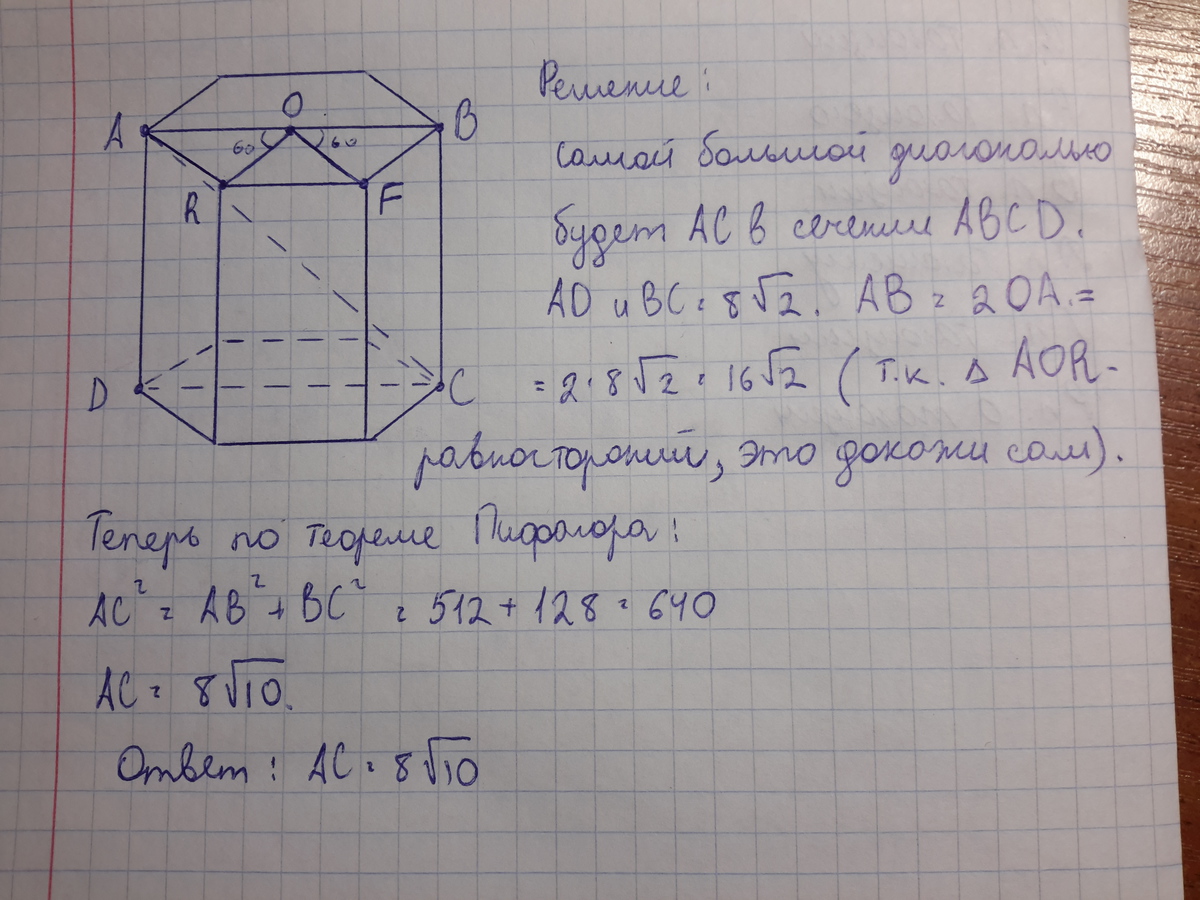 ДЛИНЫ ВСЕХ РЕБЕР ПРАВИЛЬНОЙ ШЕСТИУГОЛЬНОЙ ПРИЗМЫ РАВНЫ. ДЛИНА БОКОВОЙ ГРАНИ ПРИЗМЫ РАВНА 8 КОРНЕЙ ИЗ 2 СМ. ВЫЧИСЛИТЕ ДЛИНУ БОЛЬШОЙ ДИОГОНАЛИ ПРИЗМЫ.