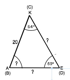 AE=20•0,8090/0,8660=18,683≈18,7 см; KE=20•0,9135/0,8660=21,097≈ 21,1 см