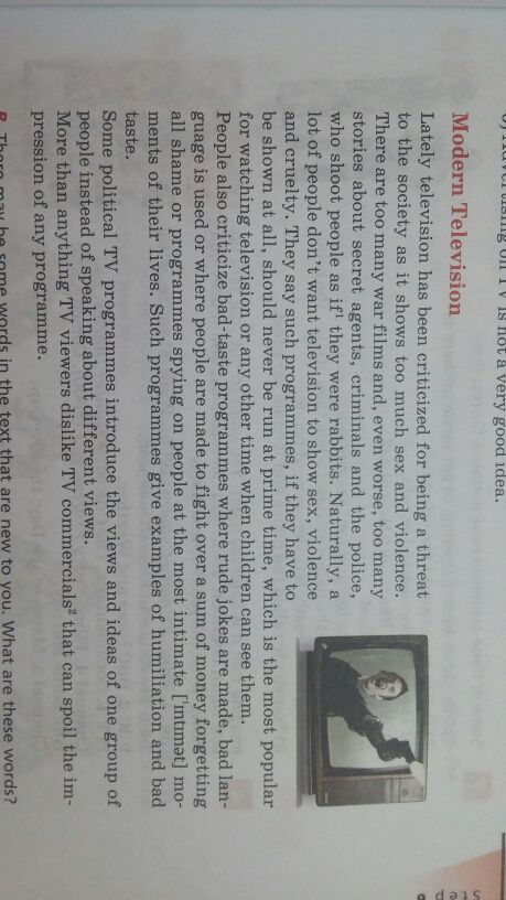 Современный последнее время телевидение было критикуют за угрозу Телевидение для общества, как это показывает слишком много секса и насилия. Есть слишком много фильмов о войне, и, что еще хуже, слишком много историй о тайных агентов, преступников и полиции, которые стреляют людей, как если бы они были кролики. Естественно, много людей не хотят, чтобы показать телевидение секс, насилие и жестокость. Они говорят, что такие программы, если они должны быть показаны на всех, никогда не должны быть запущены в прайм-тайм, который является самым популярным для смотреть телевизор или в любое другое время, когда дети могут увидеть их. программы, где грубые шутки, сделанные, плохие LAN- Люди критикуют плохой вкус GUAGE используется или где люди сделали, чтобы бороться сумму денег, забывая l'mtumat] Мор всех стыда или программ шпионаже на людей в самых интимных ментов их жизни. Такие программы дают примеры унижения и плохого вкуса. некоторые политические телепрограммы ввести мнениями и идеями одной группы людей вместо того, чтобы говорить о разных взглядов. ничего телезрители любите телевизионные ролики, которые могут испортить импе- Более Анур