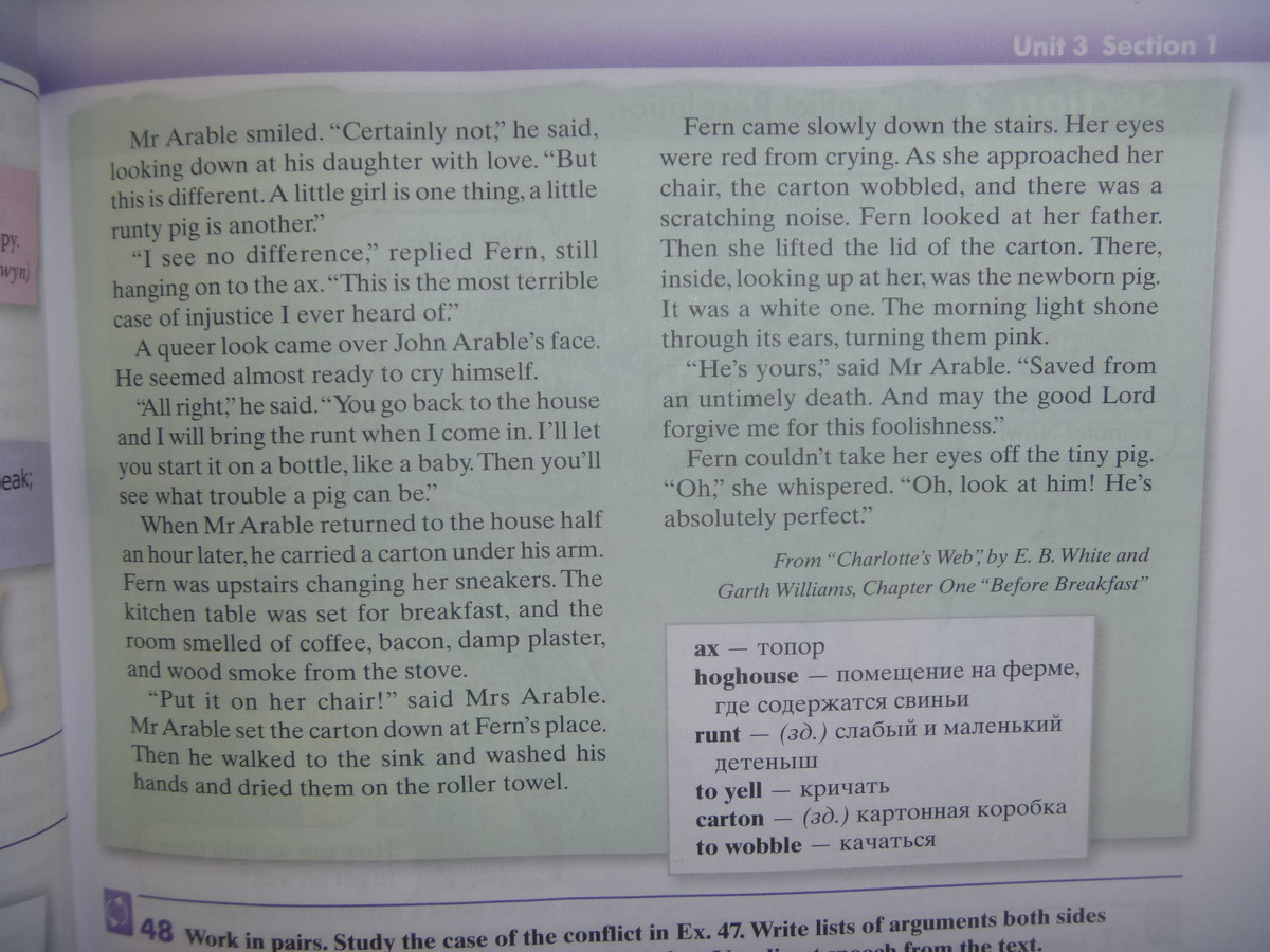 Fern пришли медленно спускаться по лестнице. Ее глаза были красными от слез. Когда она подошла к ней стул, коробки колебался, и не было царапин шума. Fern посмотрел на отца. Потом она подняла крышку коробки. Там, внутри, глядя на нее, был новорожденный поросенок. Это был белый.Утренний свет сиял через уши, превращая их розовыми.