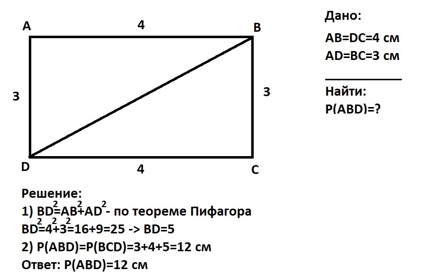 Начерти прямоугольник со сторонами 3см и 4 см. Разделить его отрезков на два треугольника .Найти периметр одного из треугольников