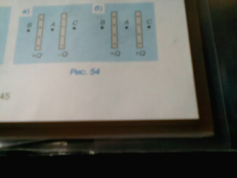 Две пластины имеют одинаковый заряд Q и площадь S. Для случаев показанных на рисунке 54 а, б найдите модуль и направление напряжённости в точках А, В, С