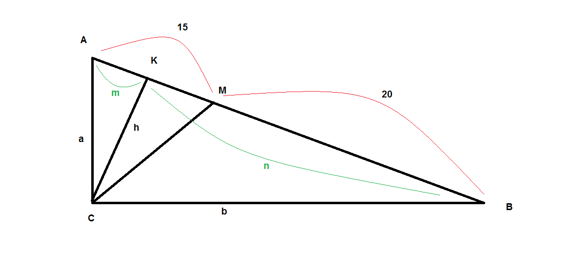 Биссекриса прямого угла прямоугольного треугольника делит гипотенузу на отрезки длиной 15 см и 20 см. Найдите длины отрезков,на которые её делит высота треугольника.С чертежём пожалуйста и побыстрее завтра сдавать,спасибо за понимание!)