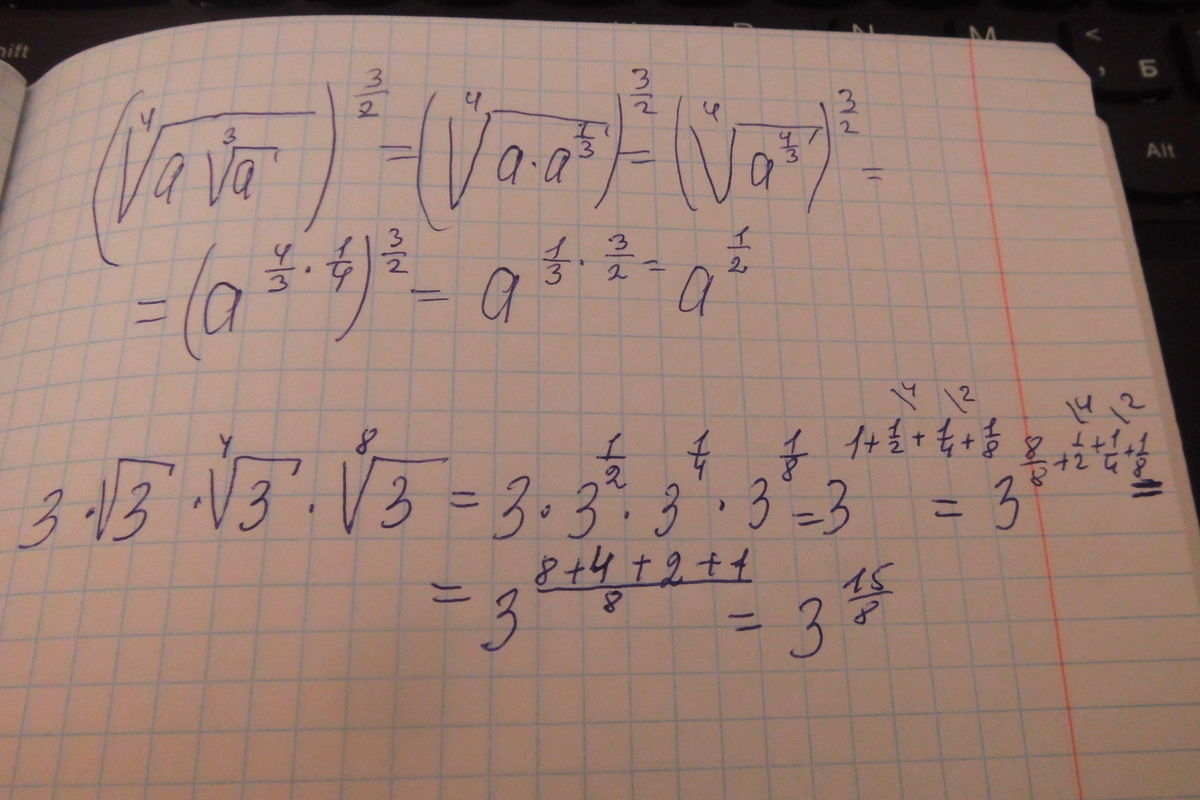 3 в первой степени умноженное на три в степени одна второя на три в степени одна четвертая на три в степени одна восьмая при перемножении степеней с одинаковыми основаниями показатели степеней складываются , то здесь мы единичку представим как восемь восьмых плюс одна вторая плюс одна четвертая плюс одна восьмая и равно три в степени пятнадцать восьмых.