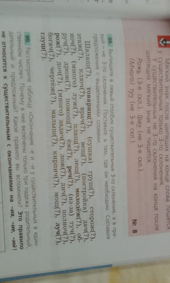 шалаш(?) ТОВАРИЩ(?) (сушка) груш(?) сторож(?) этаж(?) ключ(?) врач(?) вещ(?) (постройка) дач(?) ноч(?) (много) луж(?) плащ(?) лещ(?) МОЛОДЁЖ(?) обруч(?) дрож(?) помощ(?) ёж(?) РЕЧ(?) (из-за) туч(?) РОЖ(?) доч(?) (много) задач(?) лож(?) дич(?) полноч(?) богач(?) чертёж(?) малыш(?) кирпич(?) мощ(?) ЛУЧ(?) ГЛУШ(?)левый столбик(слова третьего склонения то есть слова женского рода оканчивающихся на -Ь): вещь, ночь, молодежь, дрожь, помощь, речь, рожь, дочь, ложь, дичь, полночь, мощь, глушь.правый столбик: шалаш, товарищ, сушка груш, сторож, этаж, ключ, врач, постройка дач, много луж, плащ, лещ, обруч, ёж, из-за туч, много задач, богач, чертеж, малыш, кирпич, луч.У меня в школе появился новый товарищ.Приятно слышать родную речь.В этом году уродились пшеница и рожь.В окошко постучался первый луч солнца.Тропа привела нас в лесную глушь.В нашем городе активная молодежь.вещь товарищ ночь сушка