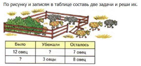 по рисунку и записям в таблице составить две задачи и решить их. было 12 овец убежали ? осталось 7 овец и было ? убежали 3 овцы осталось 8 овец .