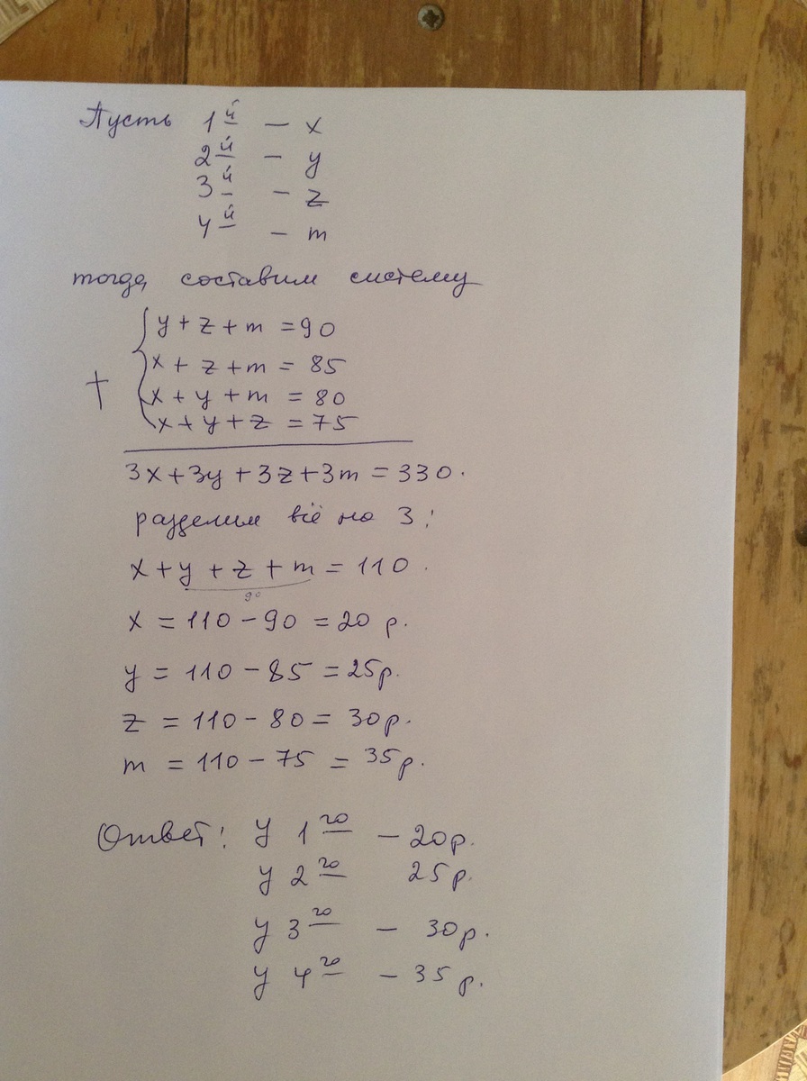 четверо ребят заметили что если они сложатся без первого то соберут 90 рублей без второго 85 рублей без третьего 80 рублей без четвертого 75 рублей сколько у кого денег