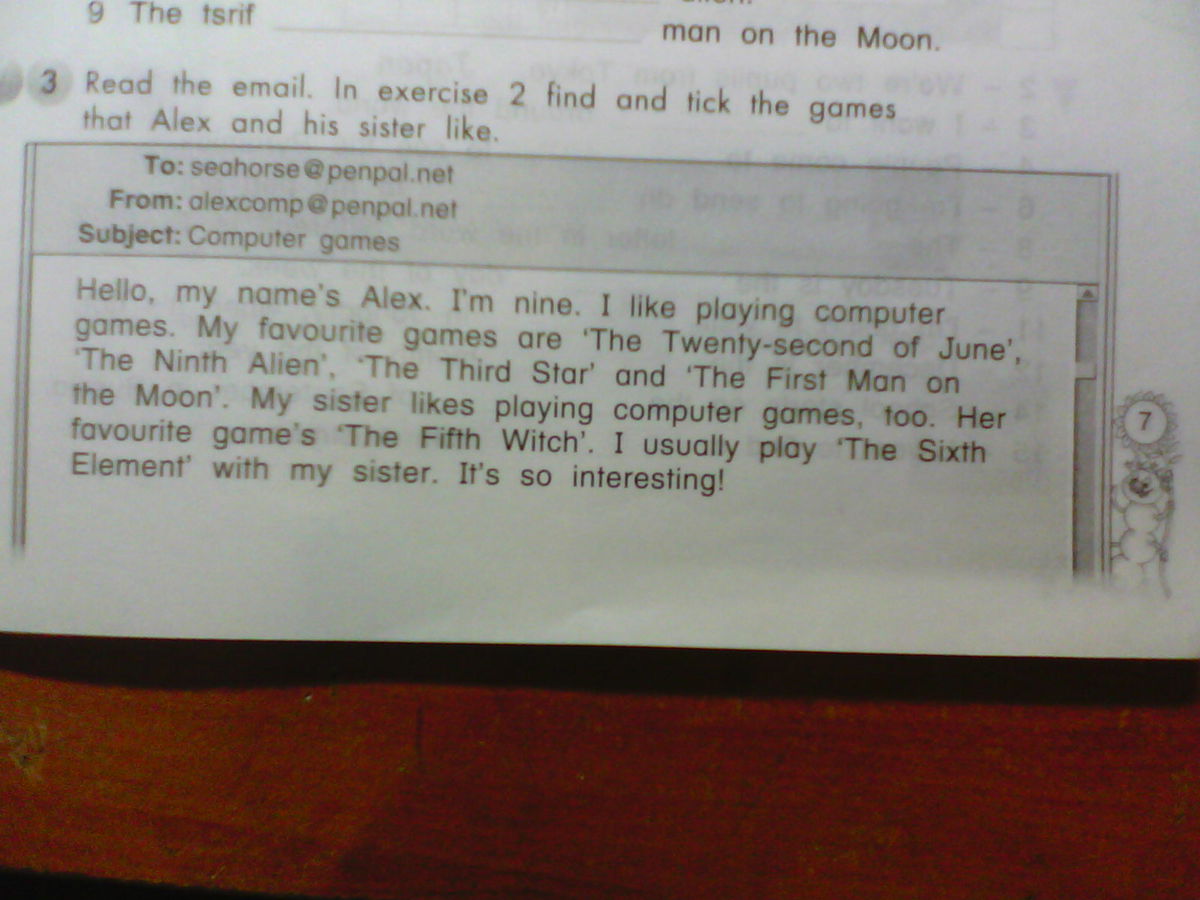 Привет. Меня зовут Алекс. Мне 9 лет. Я люблю играть в компьютерные игры. Мои любимые игры "22 июня", "Девятый чужой", "Третья звезда" и "Первый человек на луне". Моя сестра тоже любит играть в компьютерные игры. Ее любимая игра "Пятая ведьма". Я обычно играю в "Шестой элемент" с моей сестрой. Это так интересно!