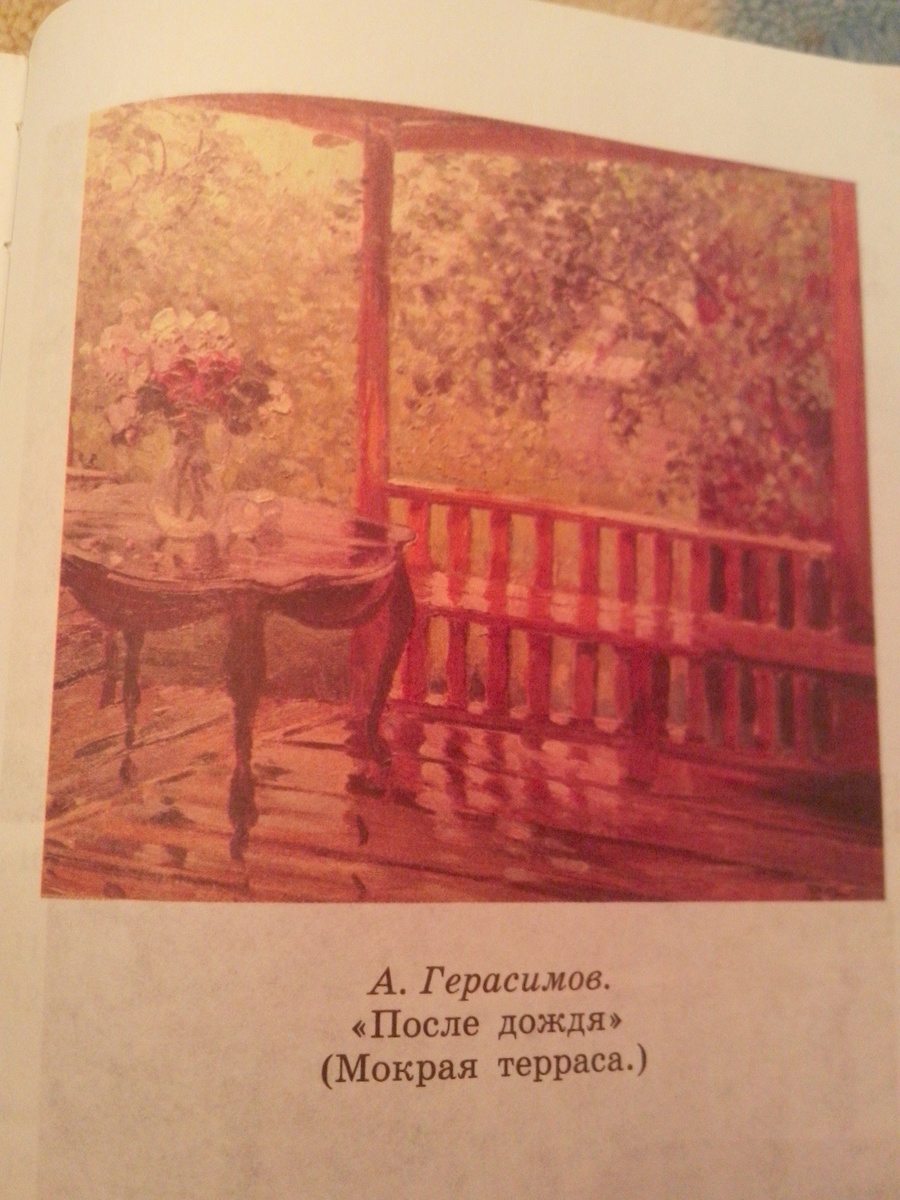 На картине А.М.Герасимова "После дождя" мы видим уголок дома,мокрую террасу.Весь двор покрыт влажным блеском.Неяркий солнечный свет лениво ложится на блестящую от дождя лавочку,стол и отражается на сыром полу.