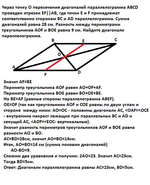 параллелограмма. Сумма диагоналей равна 28 см. Разность между периметрами треугольников AOF и BOE равна 9 см. Найдите диагонали параллелограмма