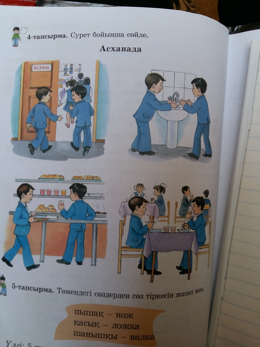 Марат пен Ермек үлкен қоңырауда асханаға барды. Олар біріншіден қолын жуды. Содан кейн олар асханашыдан дәмді тамақ пен тәтті компот сұрады. Асханашы әрине берді. Олар үстелге отырым тамақ жеді де, ауырмады. Өйткені олардың қолдары таза болды