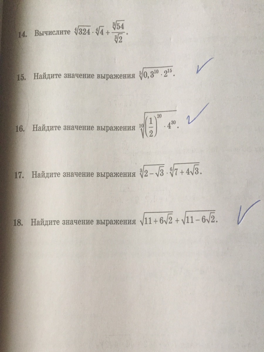 14) ![sqrt[4]{324}* sqrt[4]{4}+ frac{ sqrt[3]{54} }{ sqrt[3]{2} }= sqrt{18}* sqrt{2}+ sqrt[3]{ frac{54}{2} }= sqrt{36}+ sqrt[3]{27}=6+3=9 sqrt[4]{324}* sqrt[4]{4}+ frac{ sqrt[3]{54} }{ sqrt[3]{2} }= sqrt{18}* sqrt{2}+ sqrt[3]{ frac{54}{2} }= sqrt{36}+ sqrt[3]{27}=6+3=9](https://tex.z-dn.net/?f=+sqrt%5B4%5D%7B324%7D%2A+sqrt%5B4%5D%7B4%7D%2B+frac%7B+sqrt%5B3%5D%7B54%7D+%7D%7B+sqrt%5B3%5D%7B2%7D+%7D%3D+sqrt%7B18%7D%2A+sqrt%7B2%7D%2B+sqrt%5B3%5D%7B+frac%7B54%7D%7B2%7D+%7D%3D+sqrt%7B36%7D%2B+sqrt%5B3%5D%7B27%7D%3D6%2B3%3D9++++++++)