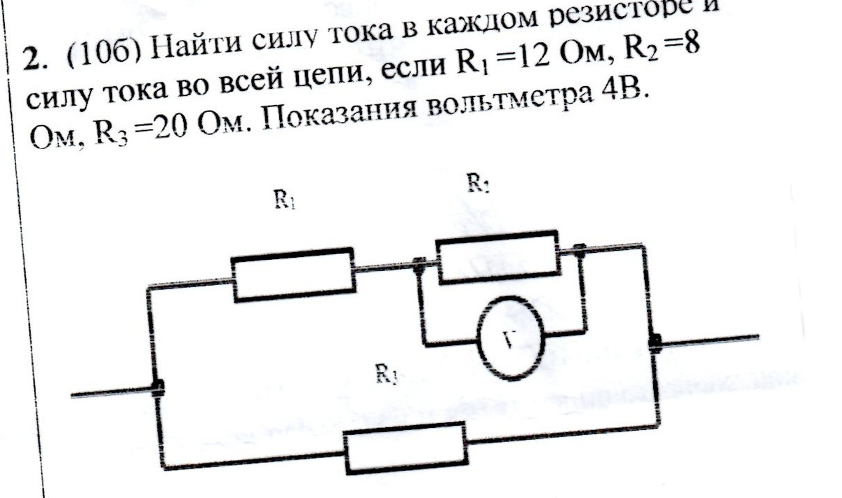 Найти силу тока в каждом резисторе и силу тока во всей цепи если R1=12 Ом R2=8 Oм R3=20 Ом . Показания вольтметра 4 В