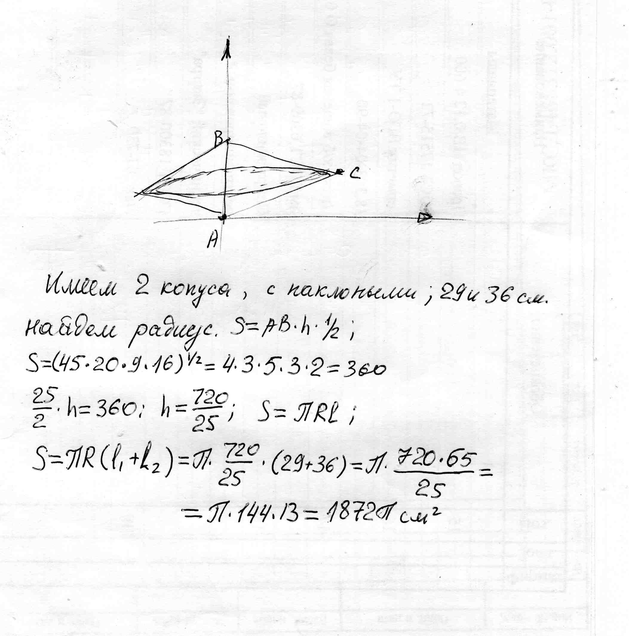 S = пи*L*29 + пи*L*36 = пи*28,8*65 = пи*144*13 = 1872*пи