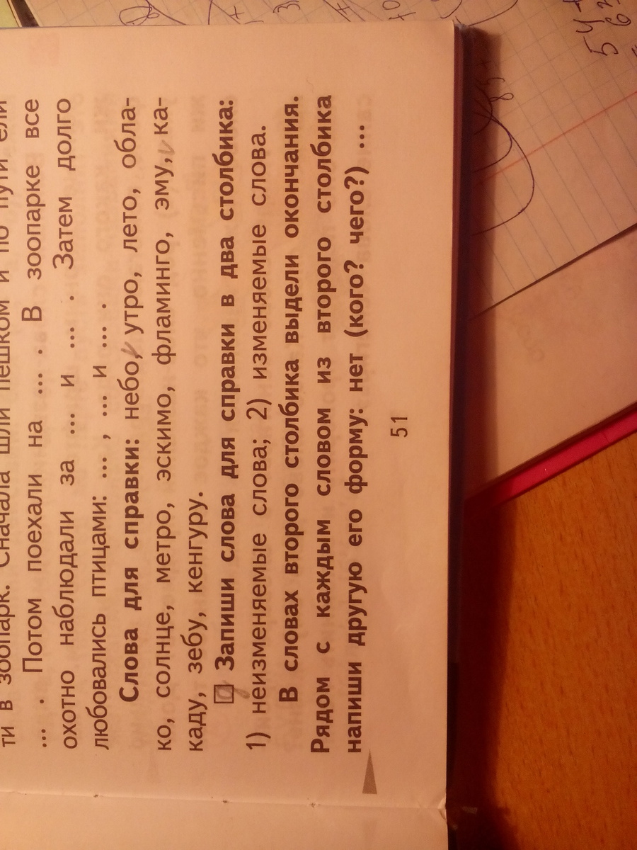 это у нас записано,какие слова нужно записать для справки в два столбика. неизменяемые и изменяемые слова? потом нужно выделить окончания у них .