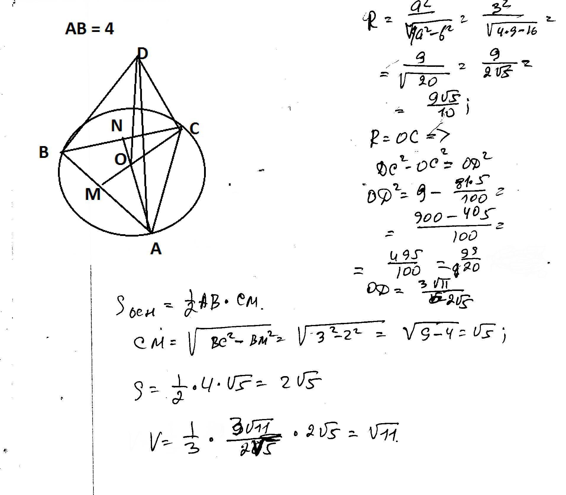 Одно ребро треугольной пирамиды равно 4 см, каждое из остальных 3 см. Найдите объем пирамиды.
