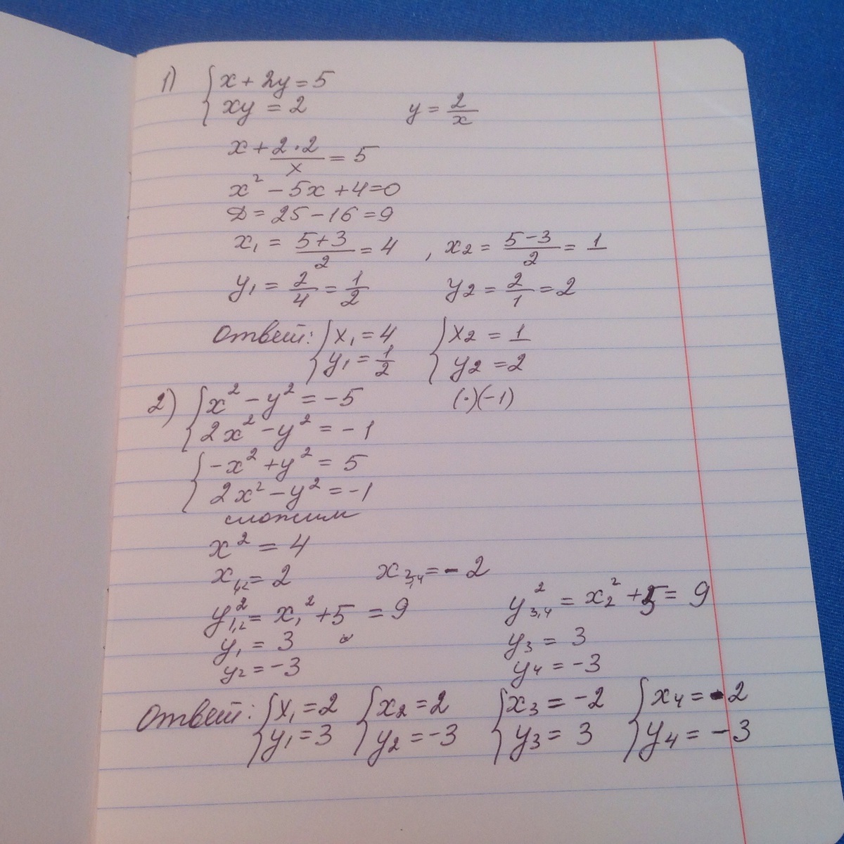 2) {x^2-y^2=-5⇒y²=x²+5