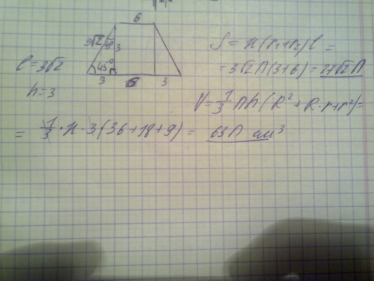 образующая прямого кругового усечённого конуса составляет с плоскостью большего основания угол равный 45. Радиусы оснований равна 3 см и 6 см.Найти площадь боковой поверхности и обьём усечённого конуса