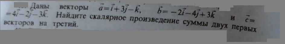 1); ; a=i+3j-k; ,; b=-2i-4j+3k; ,; c=4i-2j-3k\\a+b=(-1,-1,2)\\(a+b)cdot c=-4+2-6=-8\\2); ; a=(3,0,-6); ,; b=(4,7,2)\\acdot b=12+0-12=; ; Rightarrow ; ; aperp b\\\c=(-3,2,5); ,; d=(6,-3,1)\\ccdot d=-18-6+5=-19ne 0; ; Rightarrow ; ; overline {c}; ne; perp ; overline {d}