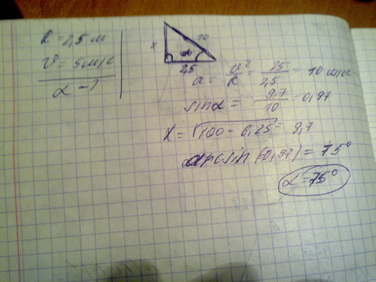 Конькобежец движется по закруглению ледяной дорожки радиусом 2,5 м со скоростью 5 м/с. Под каким углом к горизонту он наклоняется, проходя этот поворот?