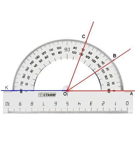 Для измерения угла ВОА (см. рис.) совмещаем риску (или небольшое отверстие) на горизонтальной стороне транспортира с вершиной угла (точкой О), а одну из сторон угла (ОА) с горизонтальной стороной транспортира.