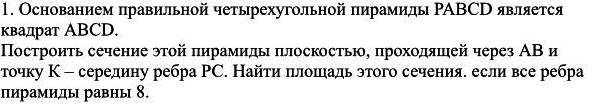 2)Проведем РК,через точку К проведем прямую параллельно АВ и точку пересечения с PD обозначим N/Проведем AN/Получили в сечении равнобедренную трапецию ABKN/ Основание трапеции AB=8 и KN=1/2*AB=4