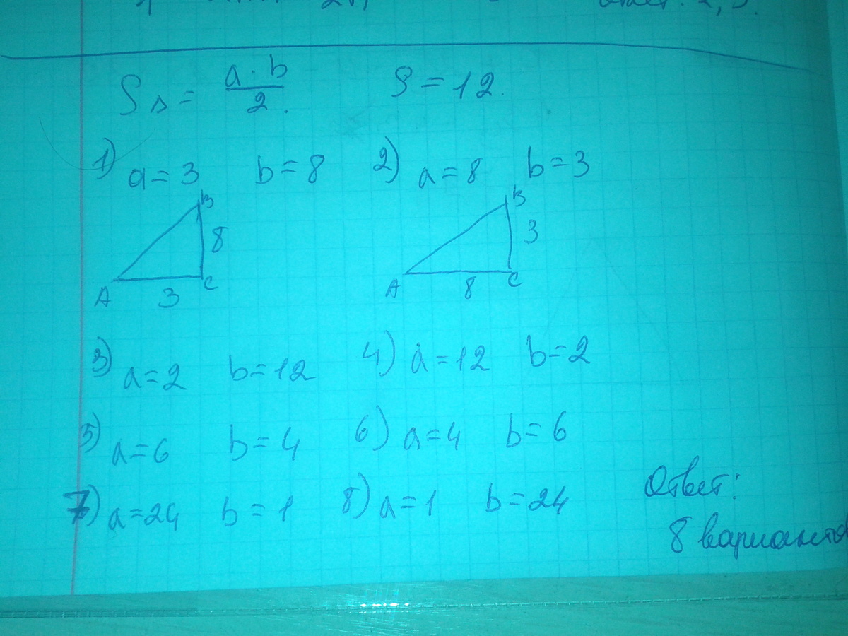 начерти прямоугольный треугольник ,площадь которого равна 12см2,сколько вариантов решения имеет эта задачи ,если длины сторон треугольника натуральные числа?
