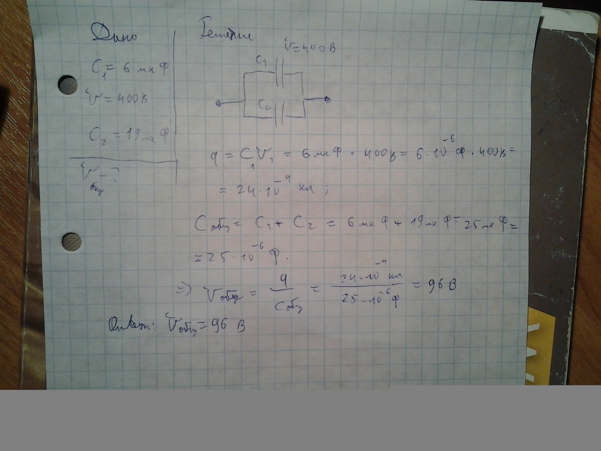 Конденсатор емкостью 6 МКФ заряженный до напряжения 400 В, соединили параллельно с незаряженным конденсатором емкостью 19 МКФ. Каким стало напряжение на конденсаторах?