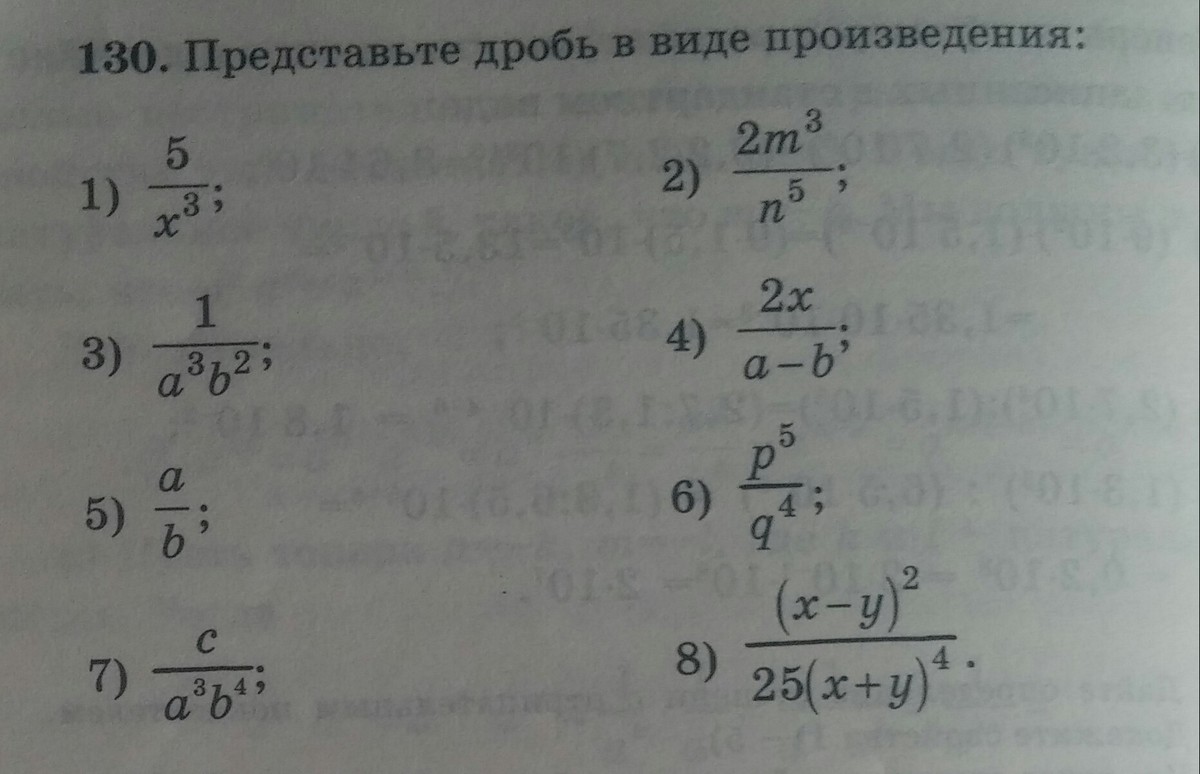 1)~dfrac 5{x^3}=5cdot dfrac 1{x^3}=5x^{-3}\\2)~dfrac {2m^3}{n^5}=2m^3cdot dfrac 1{n^5}=2m^3n^{-5}\\3)~dfrac 1{a^3b^2}=a^{-3}b^{-2}\\4)~dfrac {2x}{a-b}=2xcdot dfrac 1{a-b}=2x(a-b)^{-1}\\5)~dfrac ab=acdot dfrac 1b=ab^{-1}\\6)~dfrac {p^5}{q^4}=p^5cdot dfrac 1{q^4}=p^5q^{-4}\\7)~dfrac c{a^3b^4}=ccdot dfrac 1{a^3b^4}=ca^{-3}b^{-4}\\8)~dfrac {(x-y)^2}{25(x+y)^4}=(x-y)^2cdot dfrac 1{25}cdot dfrac 1{(x+y)^4}=0,04(x-y)^2(x+y)^{-4}\\