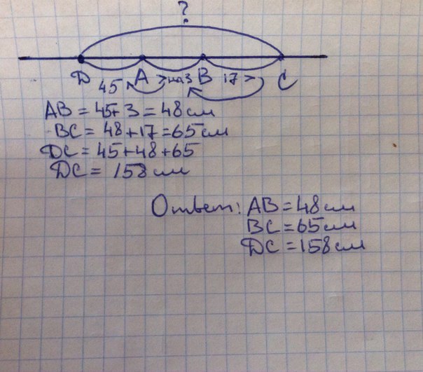 Точка В лежит между точками А и С, а точка А - между точками D и B. Найдите длину отрезка CD, если AD =45 с, AB на 3 см больше AD, а BC на 17 см больше AB. Можно фото на листке бумаги как делать эту задачу плиз