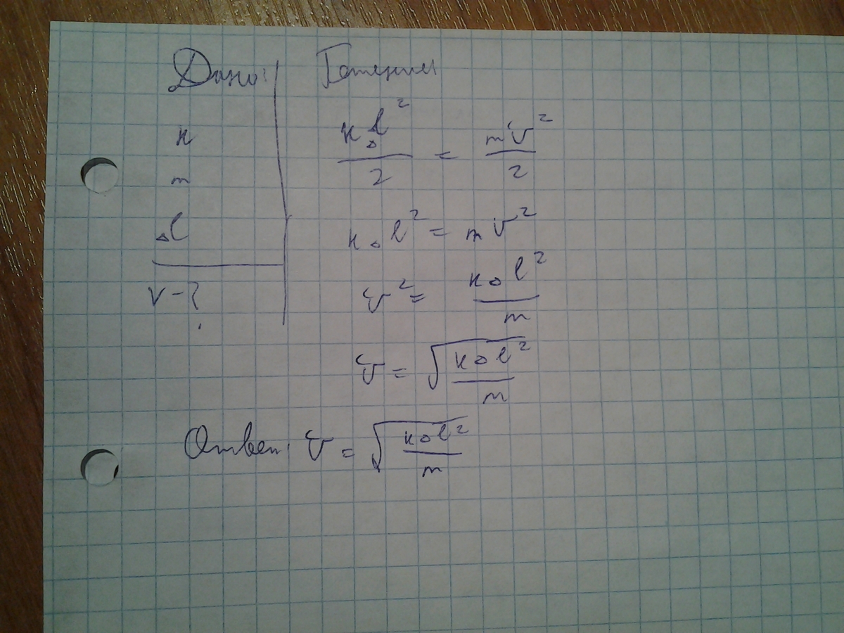Рогатка сделана из резины с жесткостью k. Рассчитайте скорость снаряда массой m, выпущенного из этой рогптки, если резину растянули на длину l и затем отпустили.
