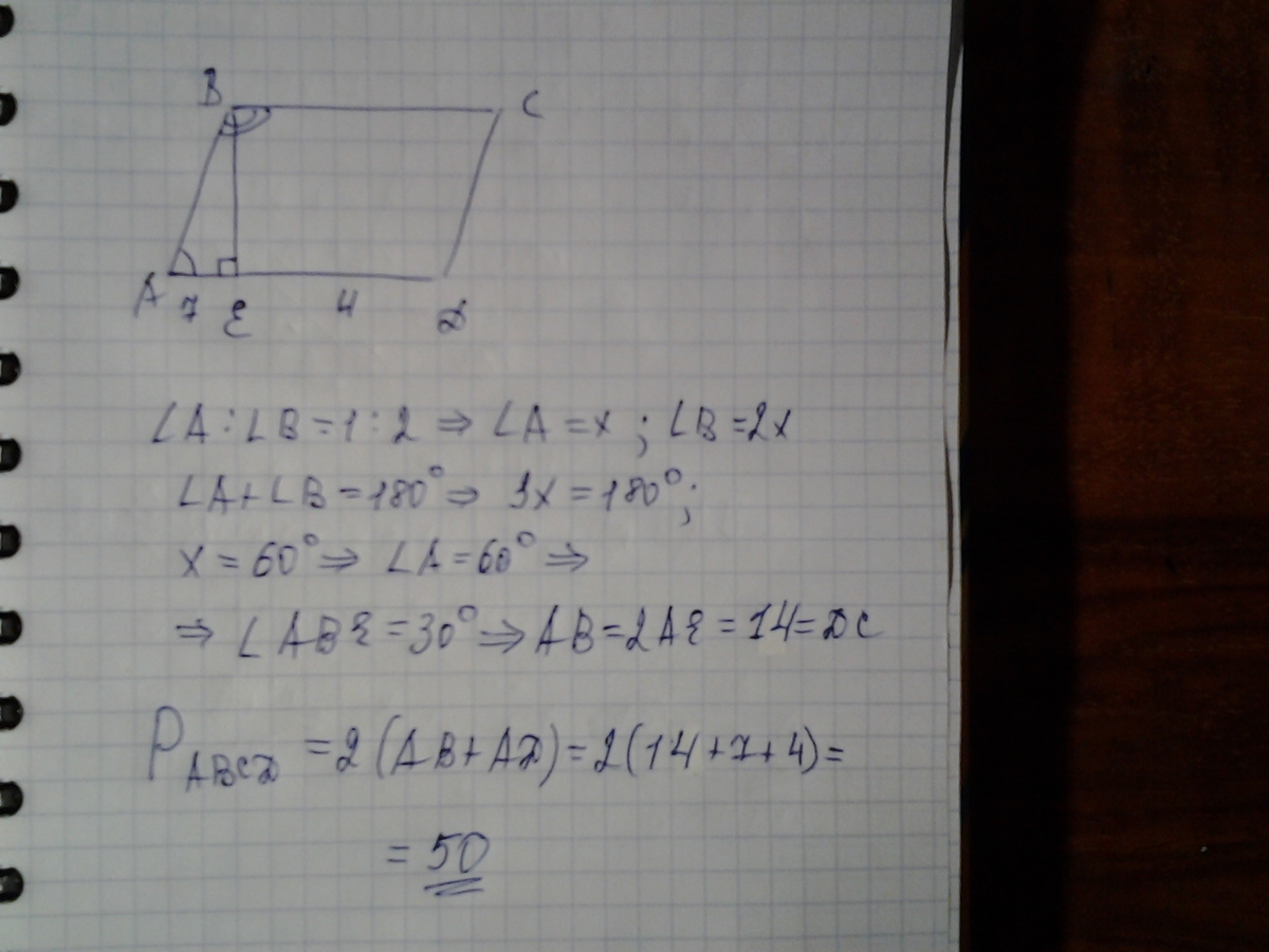 ПОМОГИТЕ!углы параллелограмма относятся как 1:2 . Высота проведённая из вершины тупого угла , делит противоположную сторону на отрезки 4 см и 7 см, считая от вершины тупого угла, найти периметр параллелограмма.