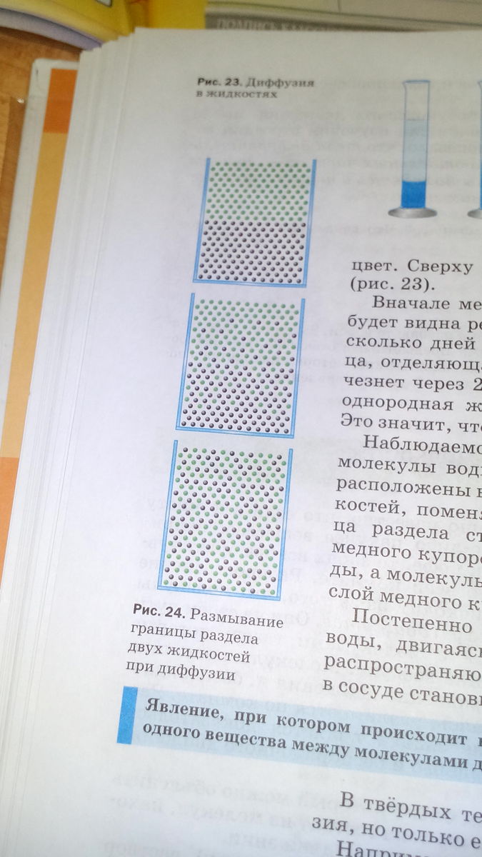 На первом рисунке мы видим границу между двумя жидкостями. Через некоторое время данная граница размывается из-за диффузии(диффузия - хаотичное проникновение молекул веществ друг в друга). В конце-концов обе жидкости смешаются и получится одна однородная жидкость.