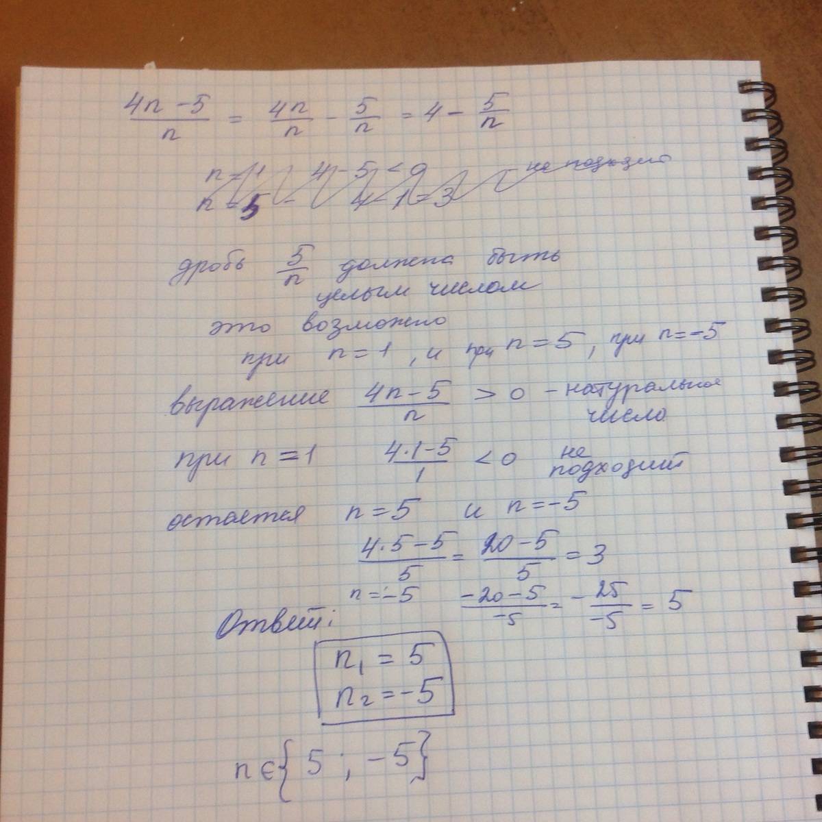 Укажите множество натуральных значений n, при которых значение дроби 4n-5/n есть натуральное число