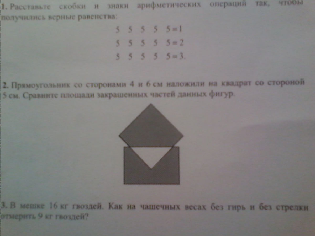 Прямоугольник со сторонами 4 и 6 см наложили на квадрат со стороной 5 см.Сравинте площади закрашенных частей данных фигур.