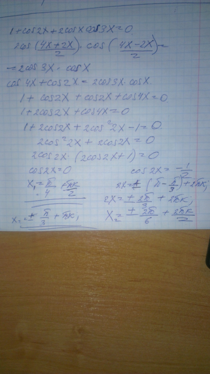 Уравнение крайне интересное, главное, решается не по обычным шаблонам, нужно в обратном порядке применить формулу суммы косинусов, чтобы выйти к ответу. А далее, разложить косинус 4x. Решение на скриншоте.