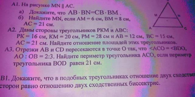 B1. Рассмотрим треугольники ABC и MNO. Они подобны. Коэф-т подобия, например, AB:MN = 1:2.