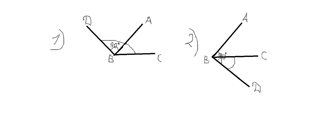 Начертите острый угол ABC. Проведите луч BD так,чтобы угол ABD был прямым,а угол CBD 1)тупым.2)острым.