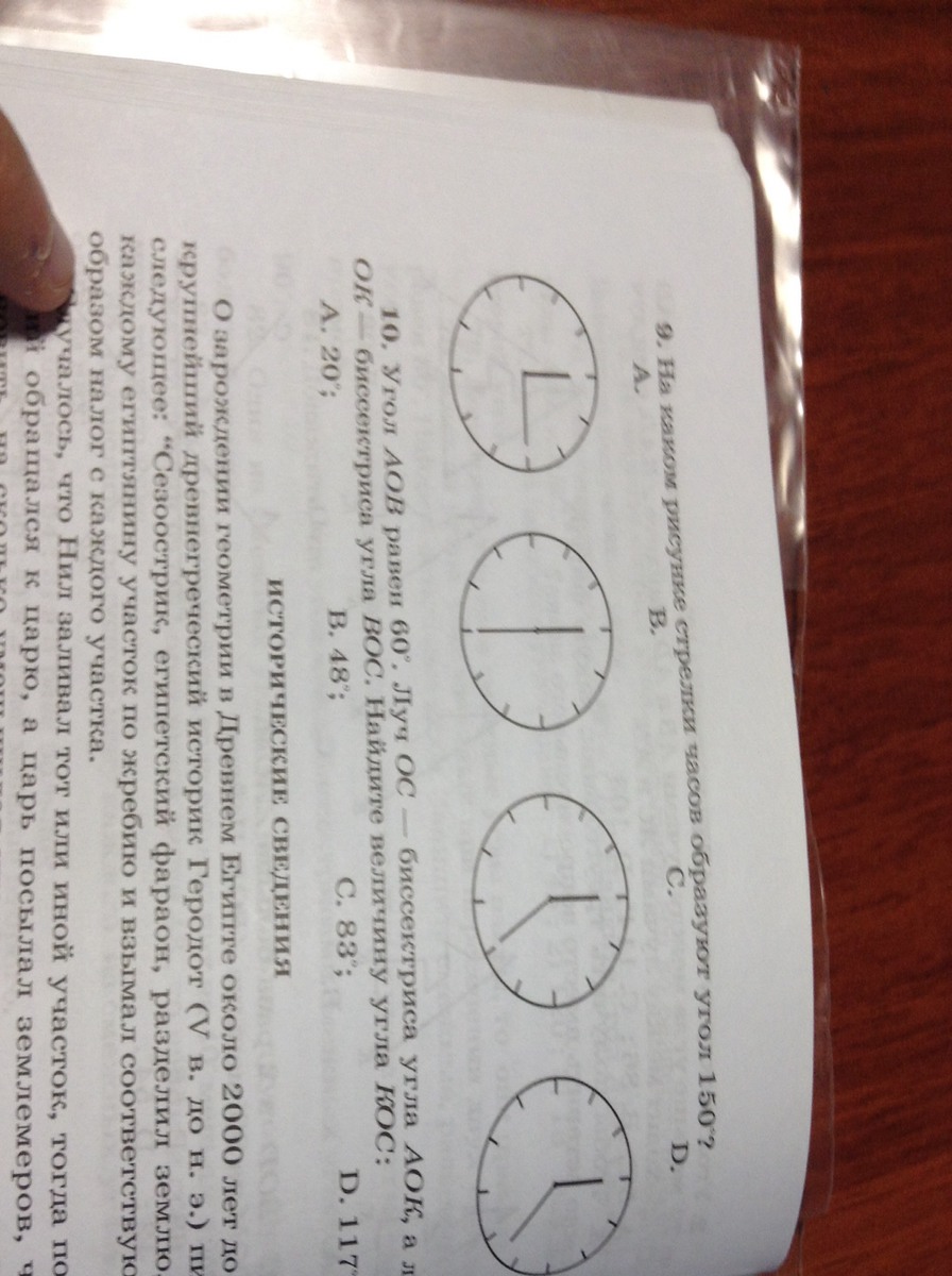 тем, кто составляет такие задачи, я бы руки повырывал. Сказали бы - на каком рисунке отрезки... и т.д. В часах стрелки ТАК не могут находиться, разве что сняты с оси и переставлены. Ну это лирика. Сектор в 180 градусов (полукруг) делится рисками на 6 частей по 180/6=30 градусов. Между рисками - 5 частей =5*30=150. Ответ - С