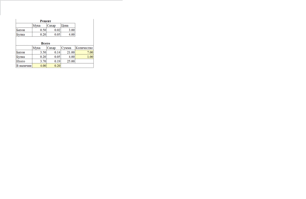 Решить задачу в Excel .Для изготовления батона надо 0,5 кг муки и 0,02 кг сахара, а для изготовления сдобной булки надо 0,2 кг муки и 0,05 кг сахара. Батон стоит 3 рубля. Булка стоит 4 рубля. У нас в наличии 4 кг муки и 0,2 кг сахара. Составьте оптимальный план выпечки батонов и булок.