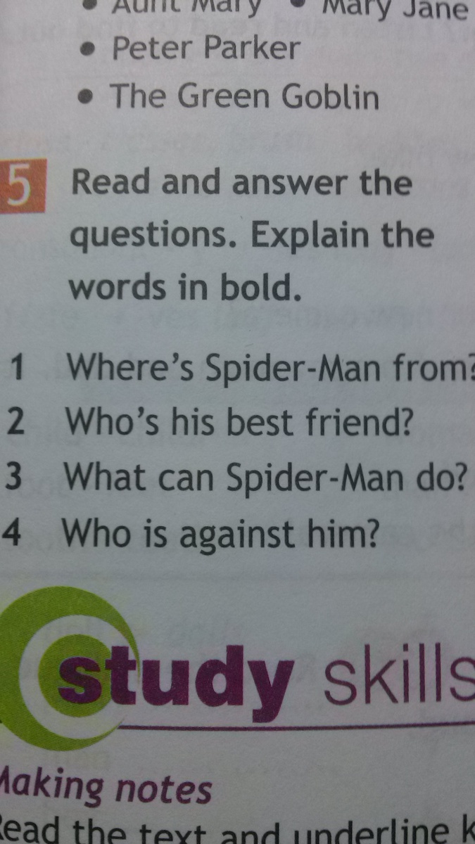 2.Mary Jane is his best friend. 3.He can climb walls, just like a spider. He is strong and fast. 4. The Green Goblin is against Spider-Man