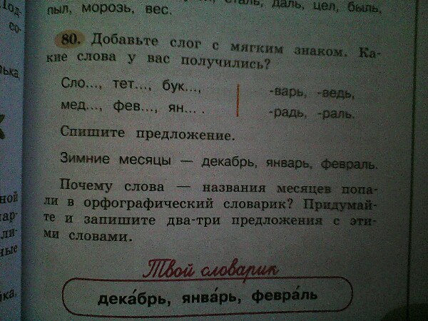 спасибо,это я понял,2 е задание, Зимние месяцы-декабрь,январь,февраль.почему они попали в орфографический словарик? придумайте и запишите два-три предложения с этими словами.