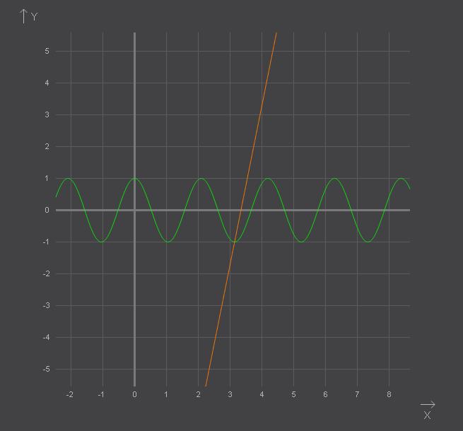 Так как графики пересекаются в одной точке, то и исходное уравнение имеет только один корень. Абсцисса точки пересечения приближенно равна 3,1: предположим, что искомый корень равен π≈3,14 и выполним проверку: