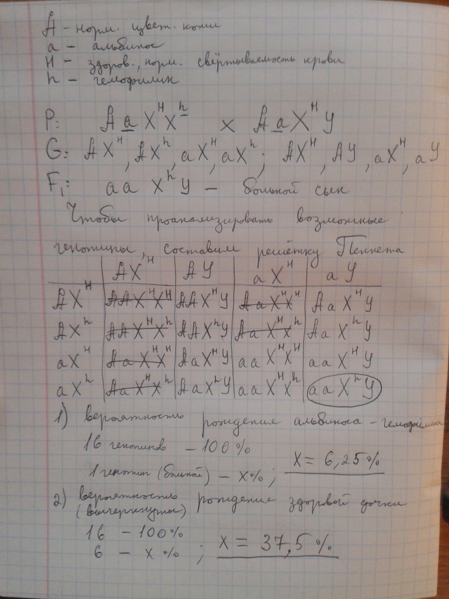 У человека ген, вызывающий гемофилию (несвертываемость крови), рецессивен и находится в Х-хромосоме, а альбинизм (отсутствие пигмента) обусловлен аутосомным рецессивным геном. У родителей, нормальных по этим двум признакам, родился сын альбинос и гемофилик. 1)какова вероятность того, что у их следующего сына также проявиться эти 2 аномальных признака?(в %) 2)какова вероятность рождение в этой семье здоровых дочерей?(в %)