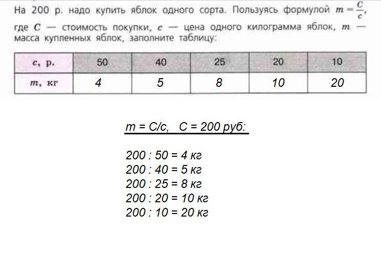 на 200 р надо купить яблок одного сорта.Пользуясь формулой м=С/с ,где С-стоимость покупки,с-это цена одного килограмма яблок,m-масса купленных яблок,заполните таблицу: с,р|50|40|30|20|10|(верхняя шапка таблицы) m,к| | | | | |{нижняя шапка таблицы}