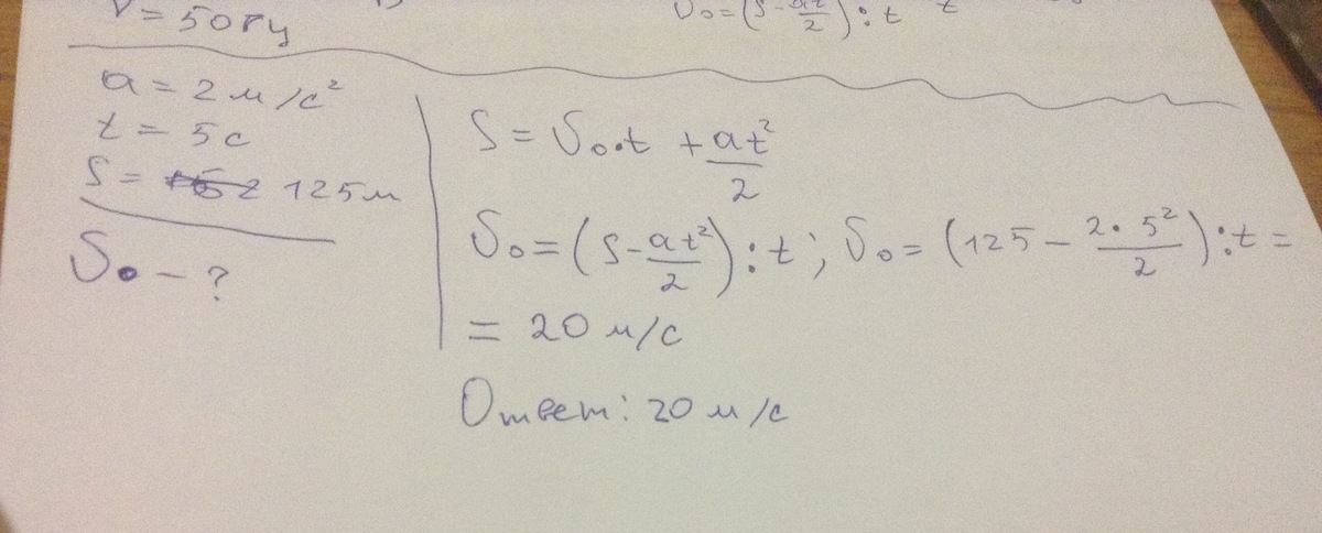 Автомобиль двигаясь с ускорением 2м/с(в квадр) за 5 секунд прошёл 125 метров. Нужно найти начальную скорость автомобиляHelp me. Please